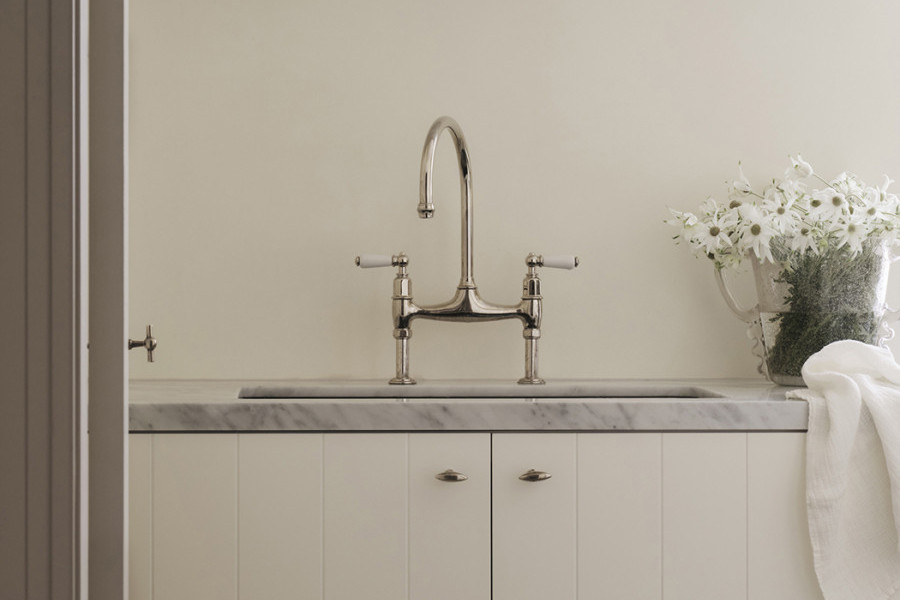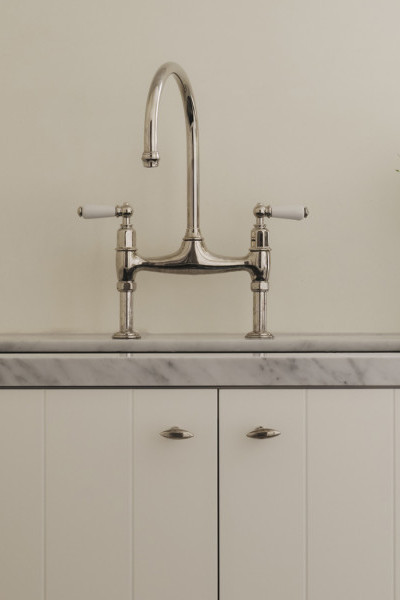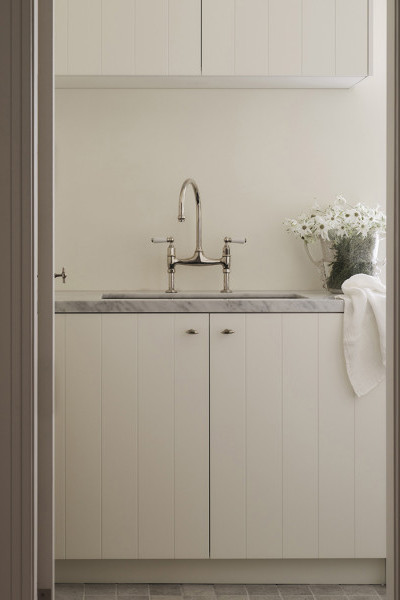 In today's well-planned modern homes, a stunning and practical laundry room is an essential feature. In keeping with their commitment to quality and refinement, the laundry room is equipped with premium fittings, including the Perrin & Rowe Ionian bridge style tap in the Nickel finish.