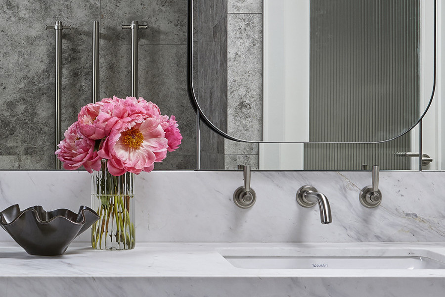 Perrin & Rowe bathroom tapware is made to last. Each item is carefully designed and manufactured to the highest quality in England. Melissa Balzan Design has specified the 180mm reach Contemporary basin tap in Pewter finish, alongside comprehensive shower set with pressure balanced mixer, handshower as well as a diverter to a ceiling mounted rain shower.