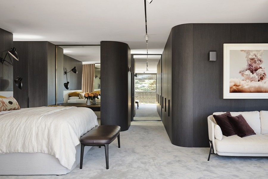 Joseph Giles hardware is a commanding presence in this Sydney bedroom by Pohio Adams Architects. The Edge Pull handles are installed as a pair on either side of the doors, meeting in the middle to provide a symmetrical closure in Joseph Giles' signature Dark Bronze Waxed finish. The Ascot leather pull handle brings a softness to the stone bedside cabinets.