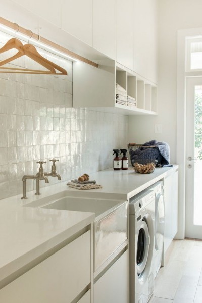 This laundry confirms that less is more when designing coastal and contemporary interiors. The cleverly devised joinery allows for necessary storage, whilst the addition of handmade Moroccan tiles, delightful pewter Mayan taps by Perrin & Rowe and statement Acquello fireclay sink inject the space with a layer of luxury – a thoughtful inclusion for those placed on laundry duty.