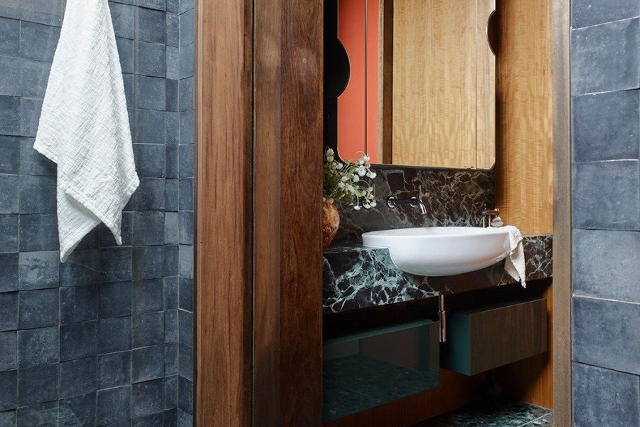 Perrin & Rowe contemporary wall mounted basin tap set is layered on Esmeralda green veined stone, natural timbers and Casa Handmade 'Charcoal' tiles.