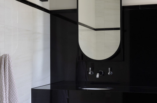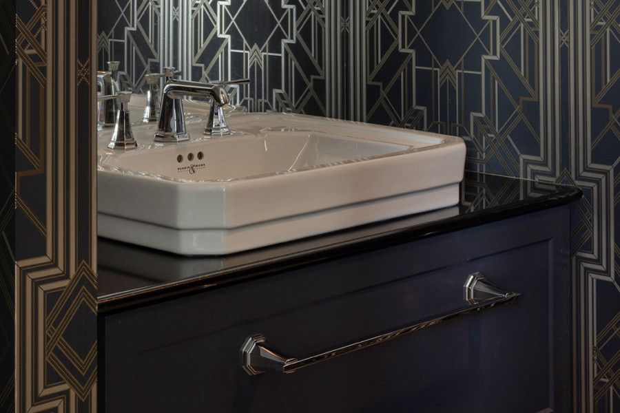 A striking Art Deco inspired rebuild of a family home in Christchurch. This powder room by Michelle Lamb features Perrin & Rowe Deco tapware and Deco towel rail in Polished Chrome.