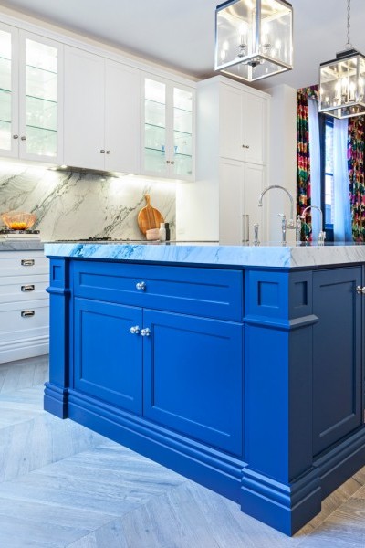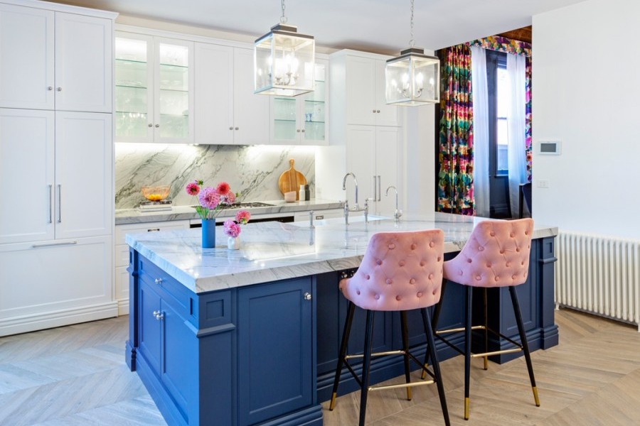 This captivating design by homeowners in collaboration with architect Peita De Trizio, achieves a sense of grandeur whilst remaining a serene and inviting setting for family and friends. The palette of blue, grey and white keeps the space fresh, whilst acting as a backdrop for bold pops of pink and polished nickel Perrin & Rowe tapware and Armac Martin hardware.