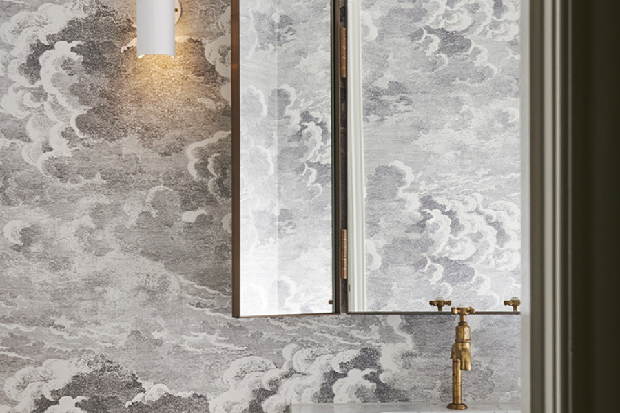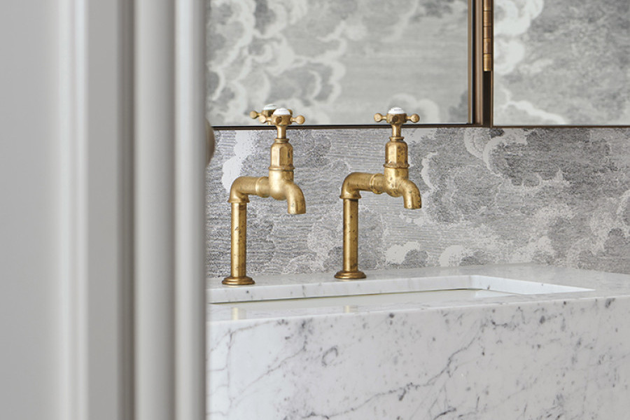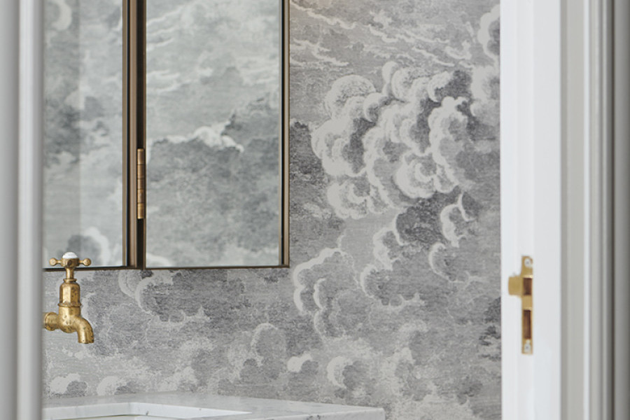 The Powder Room in this inner Melbourne Edwardian house is a calm, layered space featuring Cole and Sons Nuvolette wallpaper framing the raw finish Satin Brass Perrin & Rowe Mayan taps.