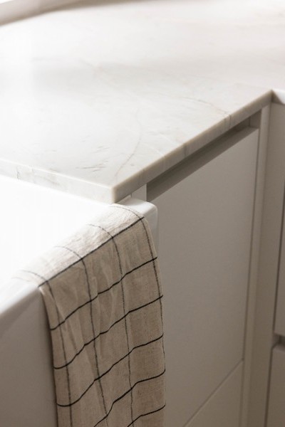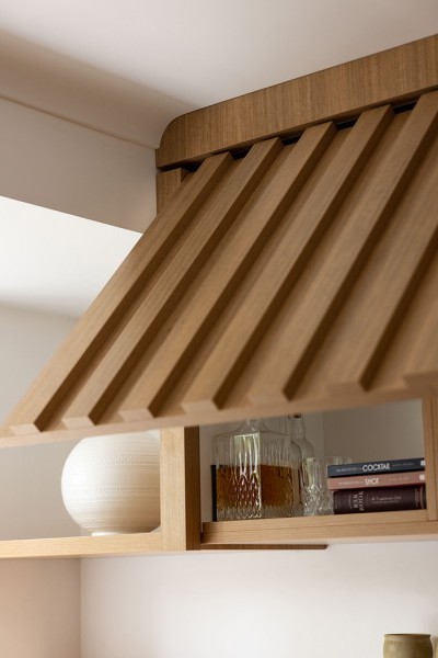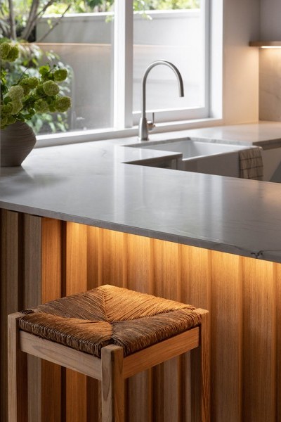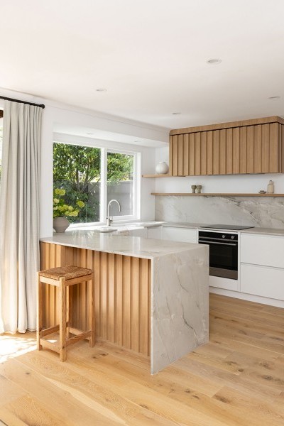 Michael Murray Studio used warm, soft colours to create a sense of calm, including wood melamine battening and subtle green hues. Marble surfaces add a luxury touch and look intriguing next to the minimalist off white cabinetry. The clients requested custom cabinetry in the living room to compliment the kitchen design style. A nod to the exterior of the home with feature battening enhance the visual texture and layers of the home. A clever “no waste” approach to the marble, managing to only require two slabs in the overall design including the living room and pantry.