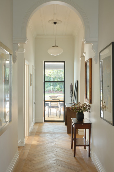 Perrin and Rowe Cabinet Handles in unlacquered polished brass quietly shine above the new oak parquet flooring by Forte, which now runs the length of the house. A steel door by Lifebuilt Construction was added at the end of the hallway to acknowledge and celebrate the blending of old and new. All the cabinetry handles by Perrin and Rowe in unlacquered brass are simple, beautiful jewellery on the shaker style satin finish joinery.