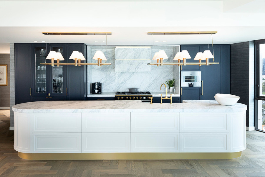The kitchen island is exquisitely detailed, with the brass skirting elevating it to a luxury, stand-alone feature.
