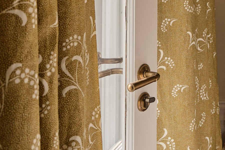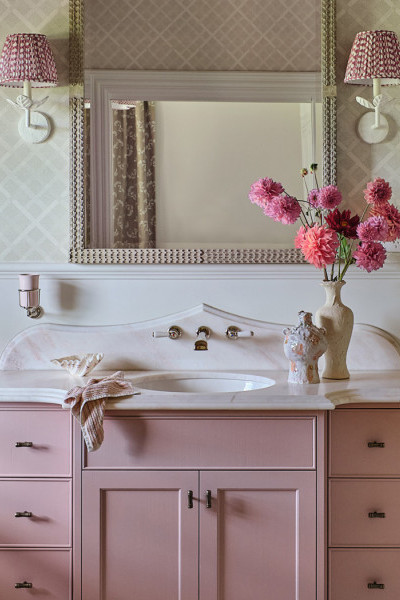The master bedroom showcases Joseph Giles Darlington lever handles, bringing a cohesive sense of craftsmanship and understated luxury throughout the space. In the adjoining ensuite, pink cabinetry paired with Perrin & Rowe tapware, featuring classic white porcelain lever handles that elevate the room’s delicate colour story. A pink tumbler from The Water Monopoly adds a playful yet sophisticated touch for everyday essentials, completing a bathroom that feels elegant, curated, and full of personality.