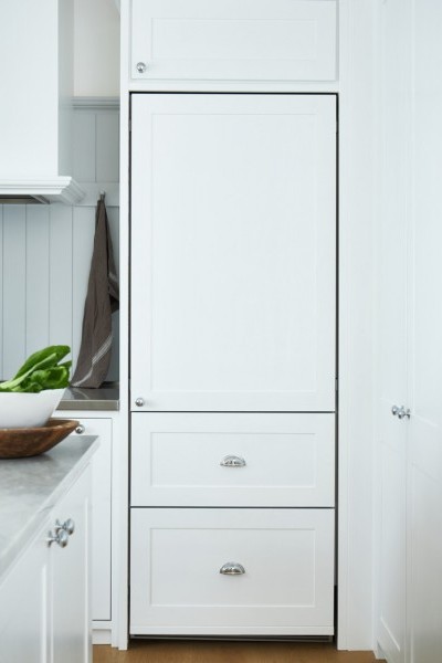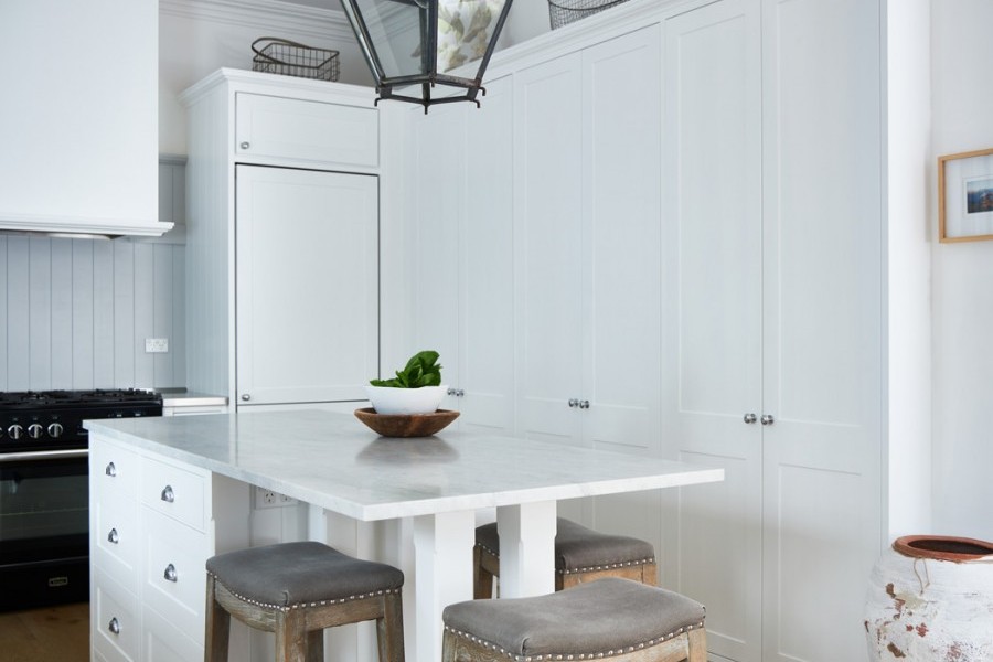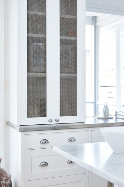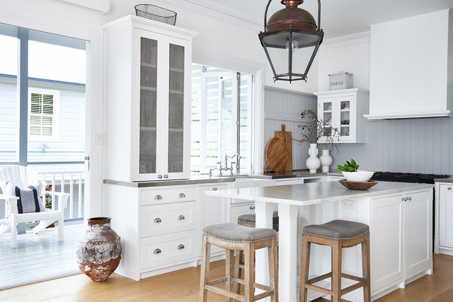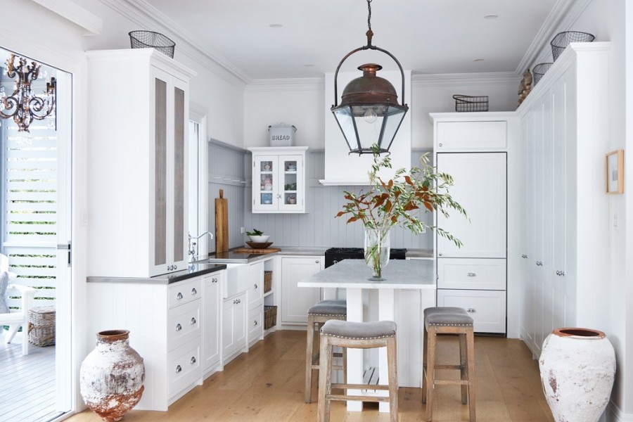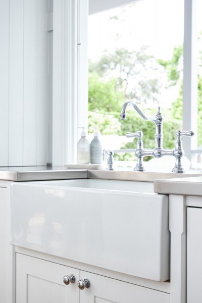 This Beecroft home by Provincial Kitchens contains a fresh white style kitchen with country details such as rustic lighting, natural timbers and chrome Perrin & Rowe Provence tapware with porcelain farmhouse style sink by Acquello.