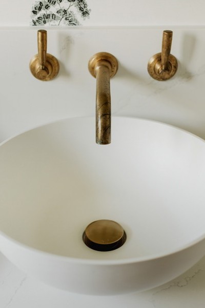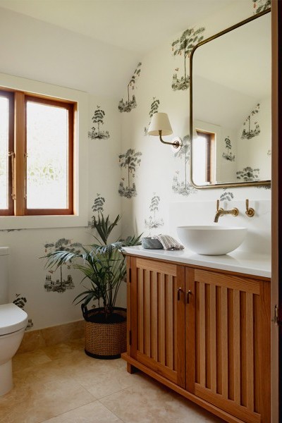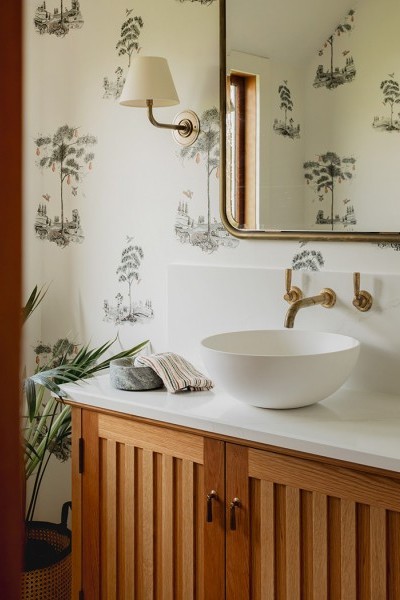 This guest bathroom by Kerryn Dunshea in collaboration with Minty Architecture is a beautiful balance of modern and traditional, with charming wallpaper providing a lovely backdrop to contemporary satin brass Perrin & Rowe tapware, fluted Joseph Giles hardware and native timber joinery.