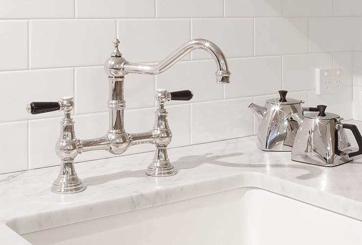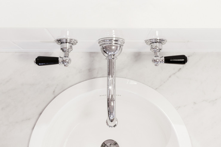 Available across the range of kitchen and bathroom taps and shower fittings, all white porcelain components, handles and levers can be ordered in black porcelain.
