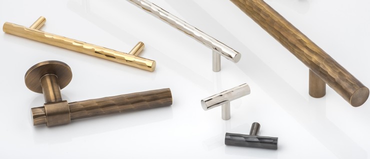 The Hammered Collection consists of door levers and door knobs, as well as pull handles and cabinet knobs in square or t-bar styles. The collection is available in the usual Joseph Giles plated finishes to give a variety of different looks. In polished chrome and nickel, each surface pleasantly reflects the lighting of the interior to mirror the ambiance of the room. When used in the dark bronze or antique brass finish, the hammered hardware takes on a more rustic look and offers rich visual warmth with the rippled and straight edges of the handle converging in vertexes of soft tone and sculptural detail.