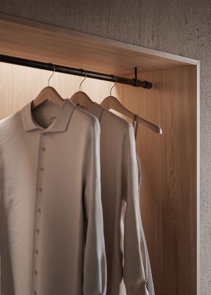 Joseph Giles tubular hanging rails can be run the full span of your wardrobe and fixed to the side walls.