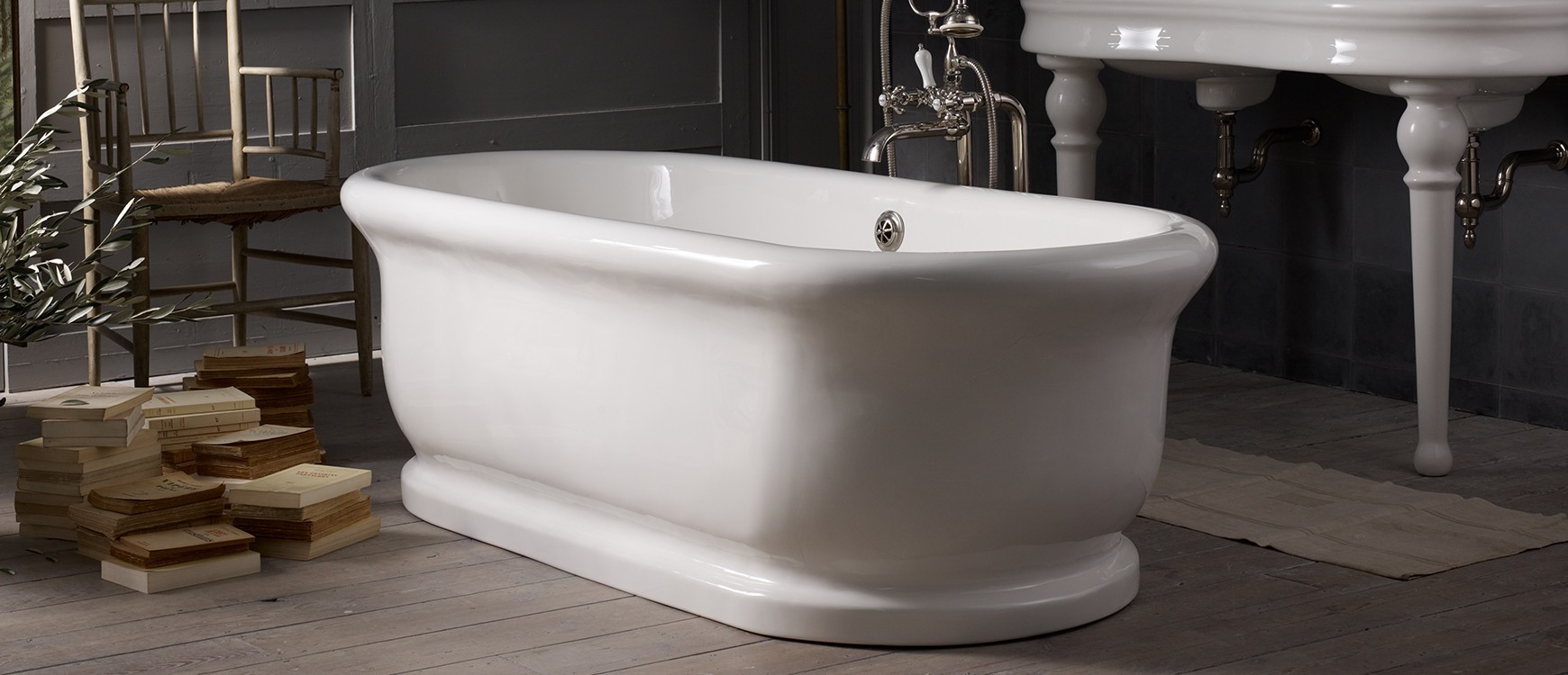 The Hanley bath is a faithful reproduction of an original fireclay bath, purchased from the Grand Hotel in Aix les Bains. It is manufactured in England from VitriteTM, a stone and mineral composite that replicates the look and feel of the original bath but without the weight.